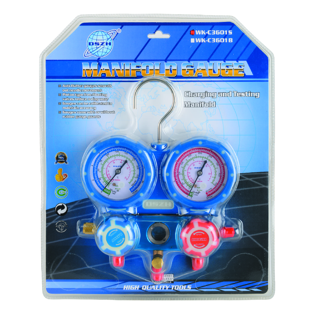 "Манометрический коллектор DSZH WK-C6002S это инструмент для определения давления в холодильном контуре. Манометры бывают аналоговые-стрелочный и цифровой. В компании РМТ можно выбрать манометры для любого назначения. Манометры помогают сервис инженеру определить: вакуум, температуру кипения фреона, давления разных фреонах а так же опрессовку азотом. Манометры бывают двух и одновентильные, вентиль перекрывает направление фреона, смотровое стекло показывает состояние фреона. В комплекте идут шланги Желтый-сервисный(к баллону фреона, азота, вакуумника). Красный-высокое давление , Синий-низкое давление. Новая серия манометрических коллекторов DSZH серии WK отличается высокой надежностью, качеством используемых материалов. Корпус манометров выполнен из алюминиевого сплава и покрыт резиной для защиты от повреждений. Металлические вставки в вентилях позволяет увеличить срок их службы./Манометрический коллектор WK-P6002S предназначен для работы с фреонами R22, R134A, R410A, R407C