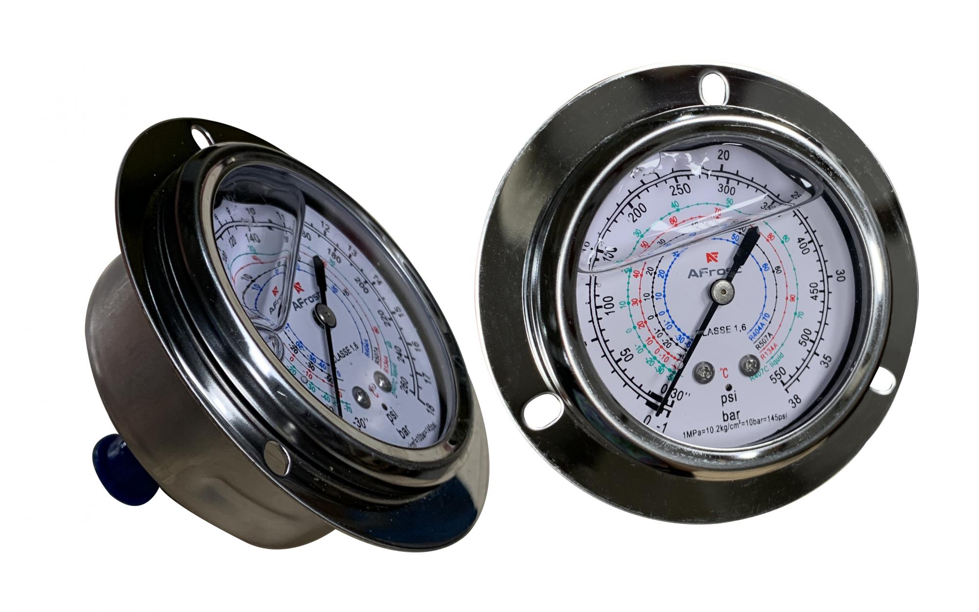 Под торговой маркой AFrost, выпускаются манометры и мановакумметры с фланцем (предназначенные для установки на панель) и заполненные глицерином.